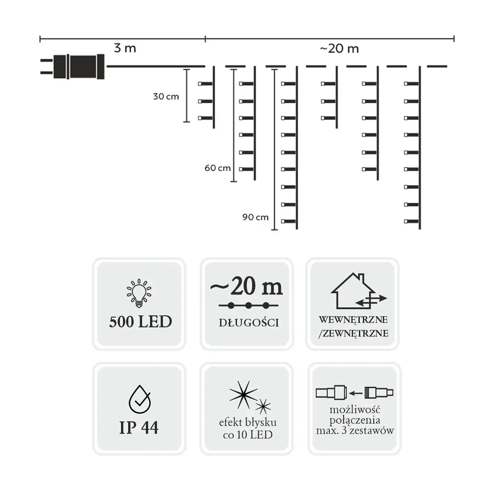 Kurtyna świetlna o długości 23 metrów, w tym 20 metrów części świetlnej, doskonale sprawdzi się jako dekoracja zarówno wewnętrzna, jak i zewnętrzna. 500 diod LED rozmieszczonych w regularnych odstępach co 10 cm gwarantuje intensywne i równomierne oświetlenie. Zimny biały kolor diod tworzy elegancką, nowoczesną atmosferę, dodając każdemu pomieszczeniu wyjątkowego charakteru.