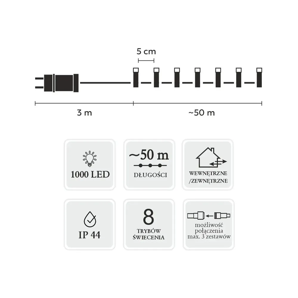 Zestaw wyposażony w 1000 diod LED oferuje wyjątkową jasność przy minimalnym zużyciu energii. Technologia LED sprawia, że lampki są trwałe i niezawodne, a jednocześnie przyjazne dla środowiska i Twojego budżetu. Zimne białe światło nadaje nowoczesny charakter każdej przestrzeni, idealnie podkreślając dekoracje świąteczne i okazjonalne.