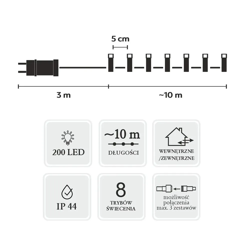 Dzięki długości dekoracyjnej 10 metrów oraz 3-metrowemu przewodowi zasilającemu, lampki umożliwiają swobodną aranżację zarówno wewnątrz, jak i na zewnątrz domu. Regularne rozmieszczenie diod co 5 cm gwarantuje intensywne, równomierne oświetlenie całej dekoracji. To idealne rozwiązanie do oświetlania większych przestrzeni, takich jak choinki, ogrody czy elewacje budynków.
