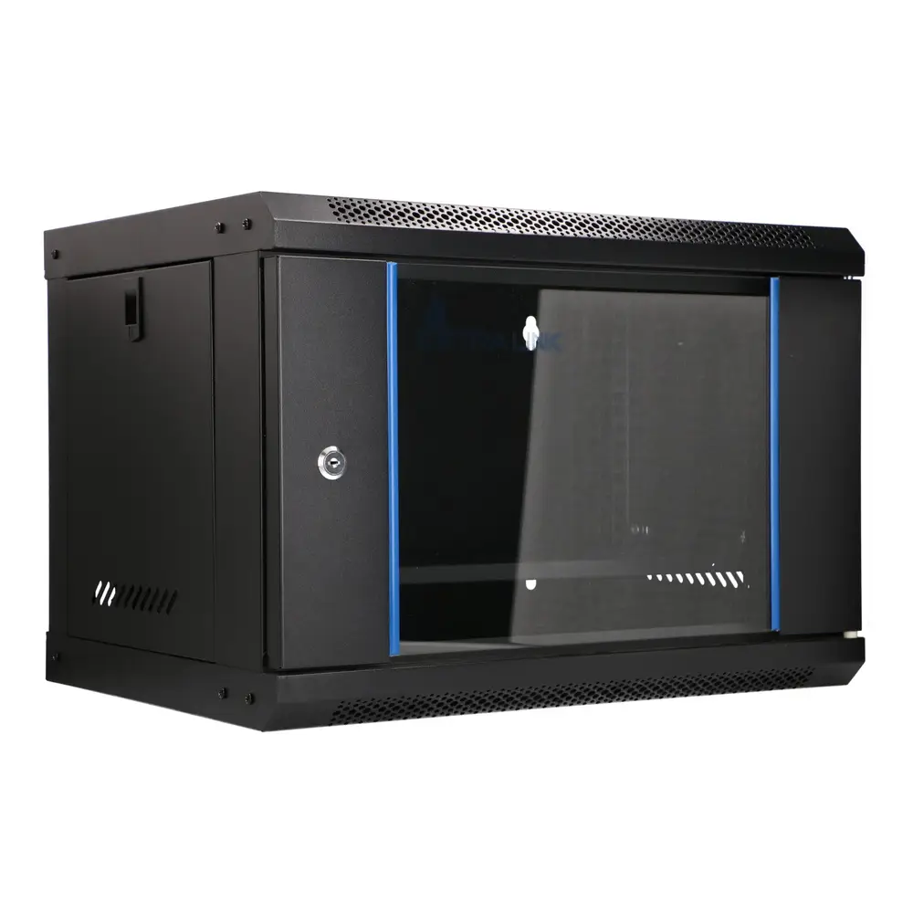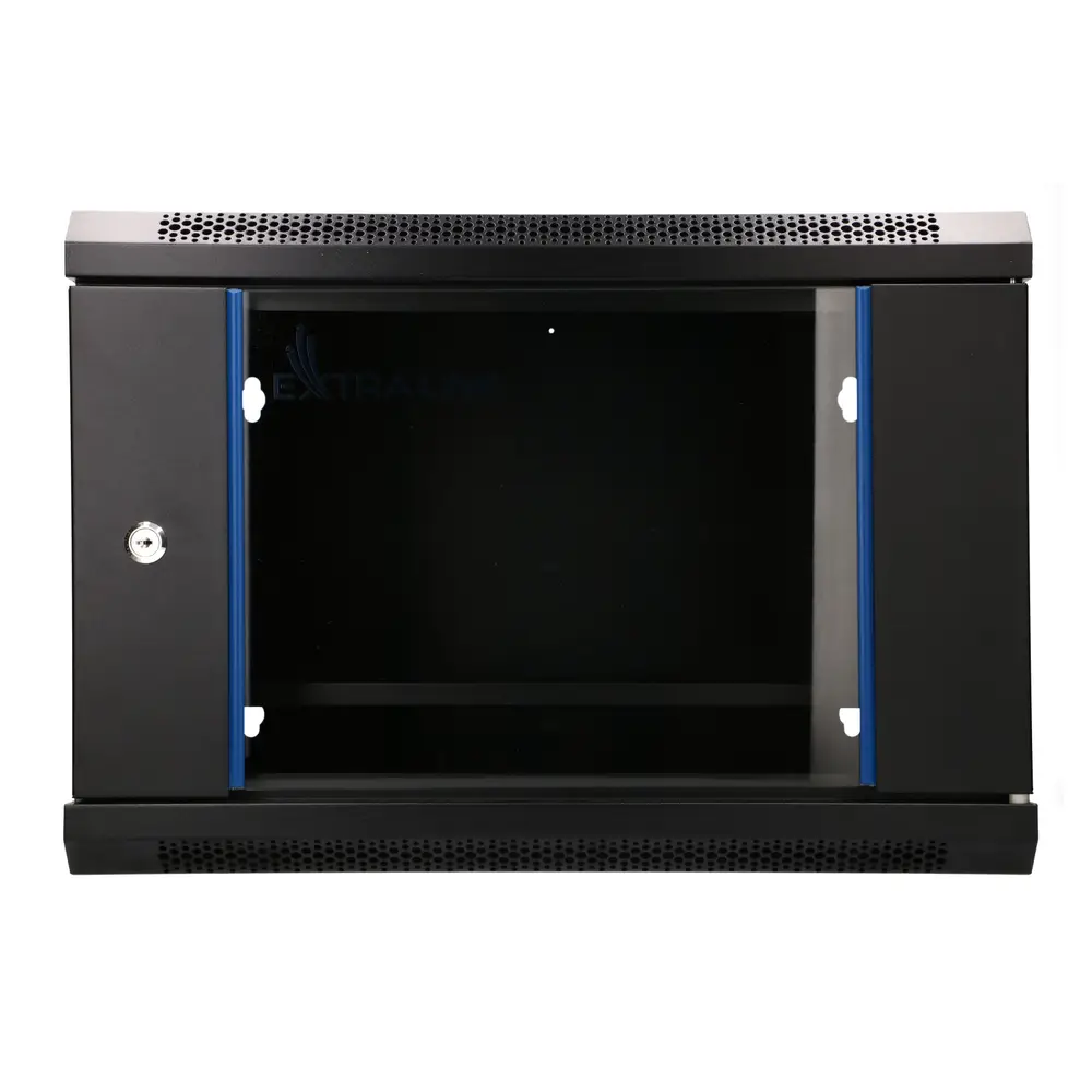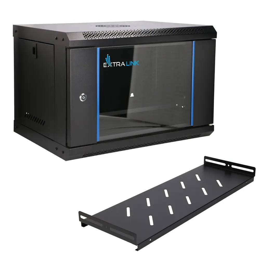 Szafa rackowa firmy Extralink jest przeznaczona do montażu naściennego w biurach, serwerowniach sieciowych oraz pomieszczeniach sterowania instalacjami CCTV. Ściany zewnętrzne wykonane są z walcowanej na zimno blachy stalowej. Wyposażone w szybę ze szkła hartowanego przednie drzwi mogą otwierać się na lewą bądź prawą stronę. W zestawie znajduje się półka.